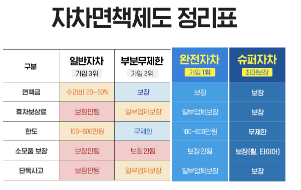 ■ 렌터카 자차보험 명칭 변경 공지 ㆍ일반 자차 : 종합보험 의무가입 (대인, 대물, 자손포함) ㆍ완전 자차 : 렌터카 이용 중 사고에 대한 보장 한도까지 이용 고객의 부담금이 없는 "차량 손해 면책제도" 보상 한도는 차종별 차이가 있으며, 약 200 ~ 400만원 한도까지 보장함. (단, 소모품에 한 해 보장 불가 (블랙박스, 네비게이션, 타이어, 타이어 휠 등) ㆍ슈퍼 자차 : 전액 보장 * 단, 만 21세의 경우 렌터사 별 현장 추가금이 발생할 수 있습니다. |